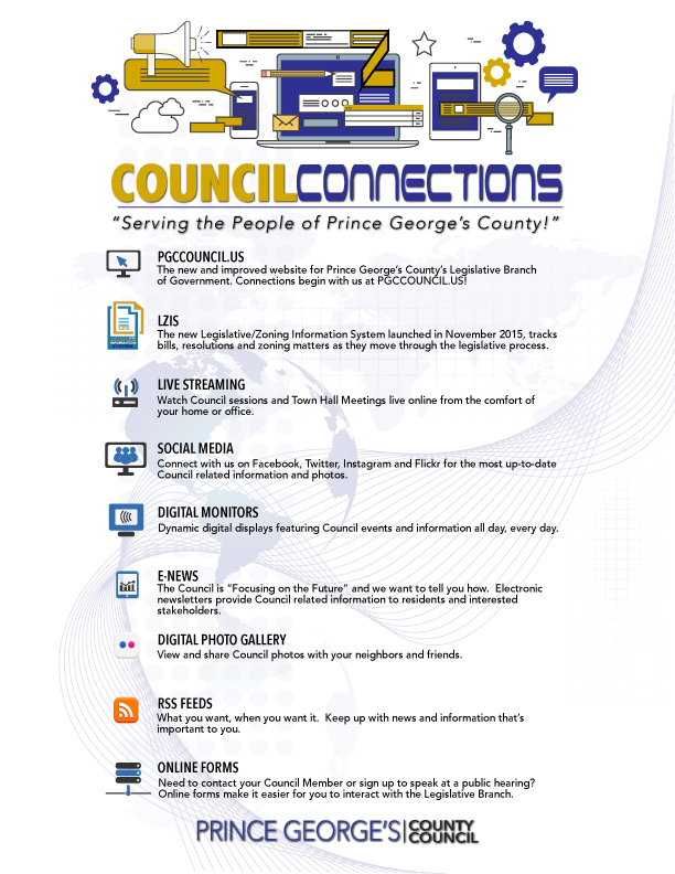 Stay connected with us! The Prince George's County Council offers various platforms for you to receive the latest information on our activities.  Subscribe to our newsletters, follow us on social media or come down to our hearings. Be engaged  in 2019!