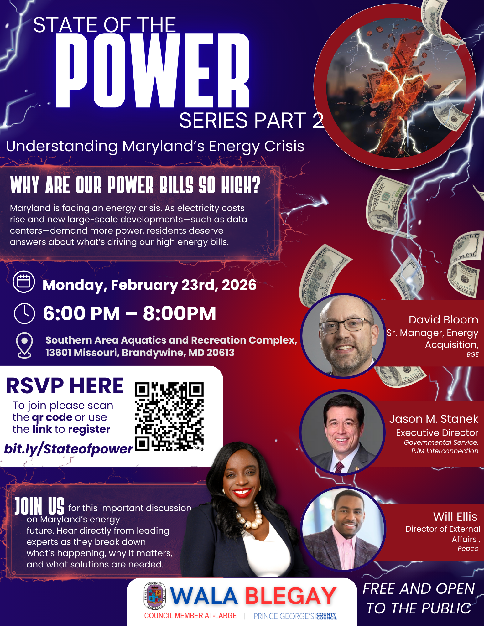 Join Prince George's County Council Member At-Large Wala Blegay, Esq. for The State of the Power, Pt. 2: Understanding Maryland’s Energy Crisis on Monday, February 23, 2026, from 6:00 PM – 8:00 PM.