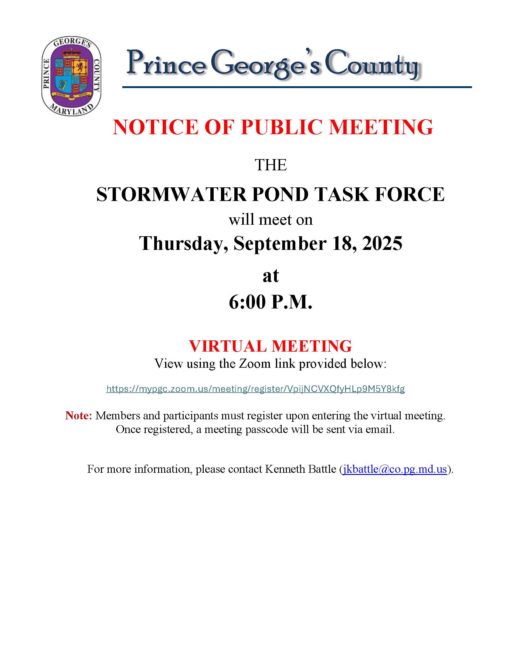 The Stormwater Task Force (CR-49-2024) was proposed by Prince George's County Council Members Wala Blegay and Ingrid Watson, and introduced by Council Members Wala Blegay, Ingrid Watson, Krystal Oriadha, Eric Olson, Calvin Hawkins and Edward Burroughs on June 4, 2024, and adopted on July 9, 2024. The Task Force was created to identify the current stormwater pond infrastructure for the stormwater ponds, currently operated or maintained by Homeowners Associations, Common Ownership Communities, and similar entities, while determining what operation and maintenance entails for the infrastructure of the stormwater ponds, the capacity for the Homeowners Associations to operate and maintain the stormwater ponds, and identify alternative solutions to operations, maintenance, and ownership to include a program of transfer of responsibilities to the County.