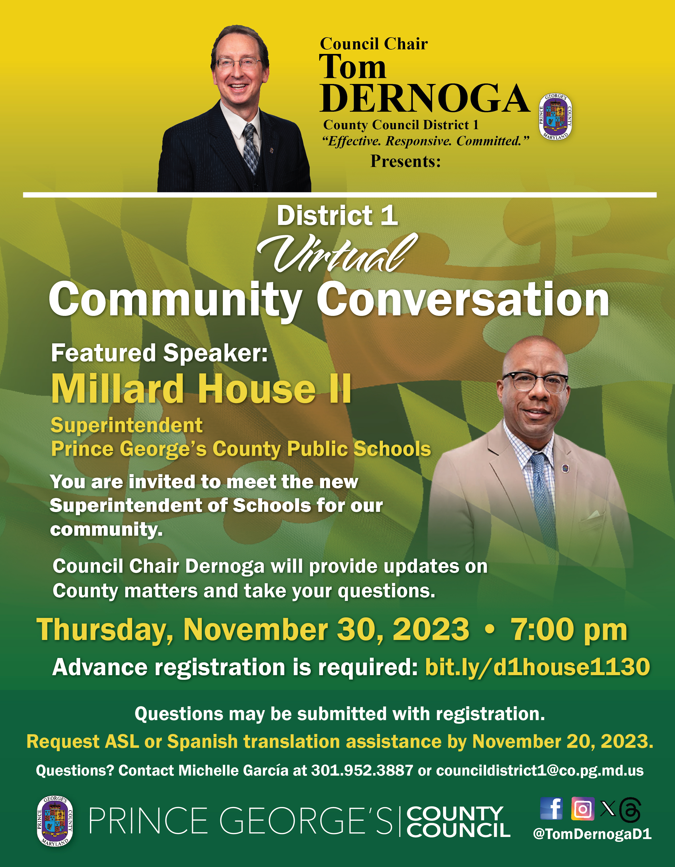 Posted on: November 13, 2023[ARCHIVED] District 1 Virtual Community Conversation featuring PGCPS Superintendent Millard House II