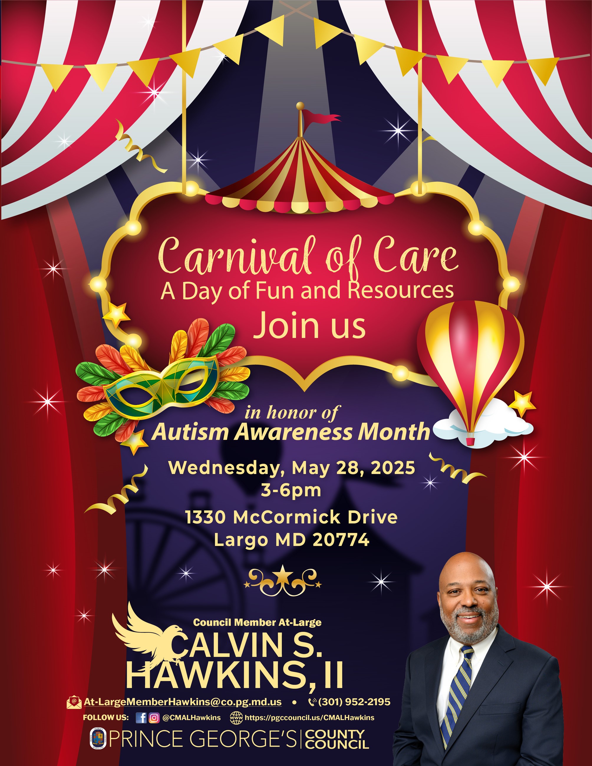Prince George's County Council Member At-Large Calvin S. Hawkins, II invites the community to step right up to the Carnival of Care, a special Autism Awareness Fair designed to bring joy to children with autism and provide vital support for their parents!