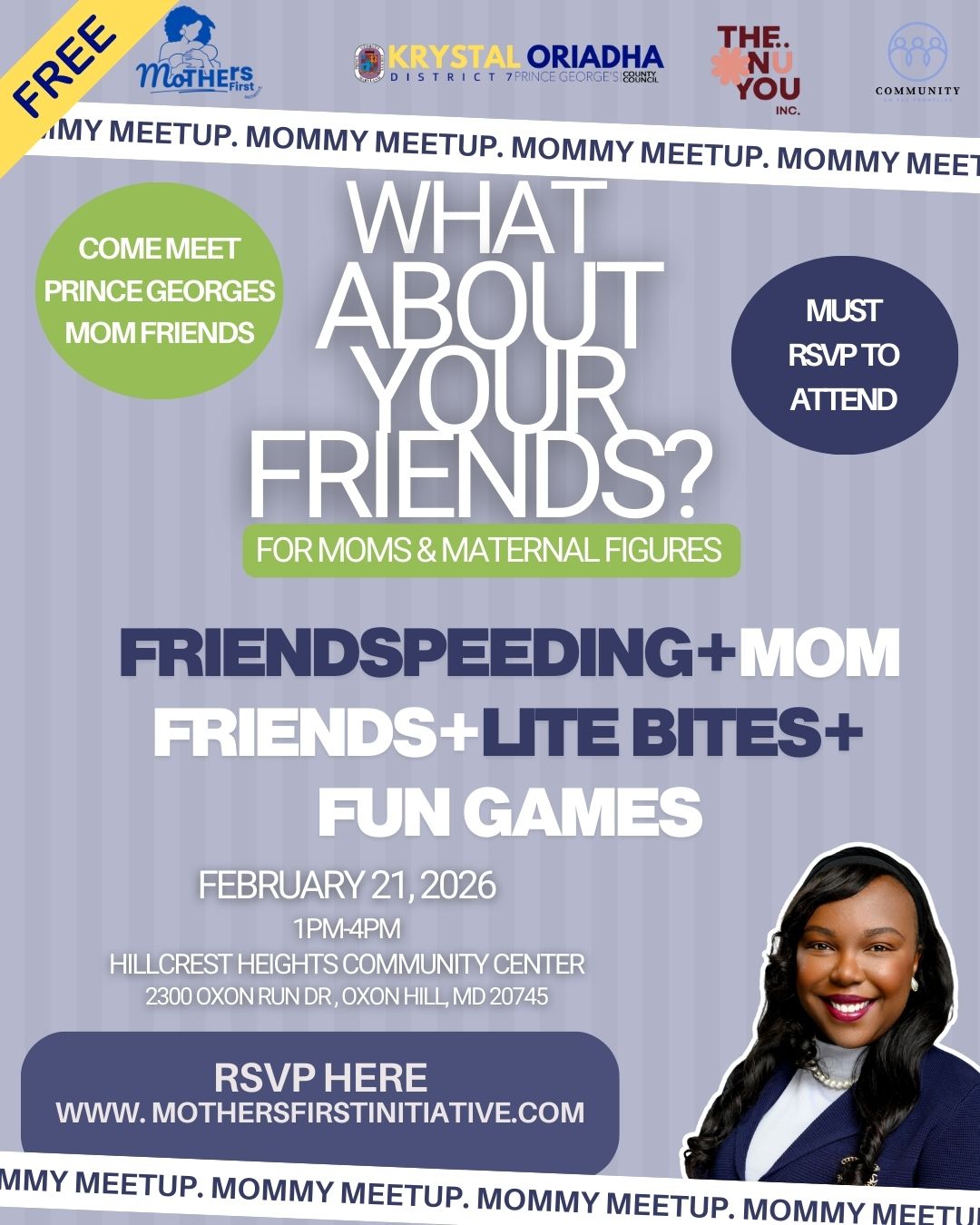 Mothers First Initiative, in partnership with Prince George's County Council Chair Krystal Oriadha and The Nu You, Inc., is excited to bring Mommy Meetups to Prince George’s County for moms and maternal figures. Be sure register for the next installment scheduled for Saturday, February 21, 2026, from 1:00 PM - 4:00 PM.